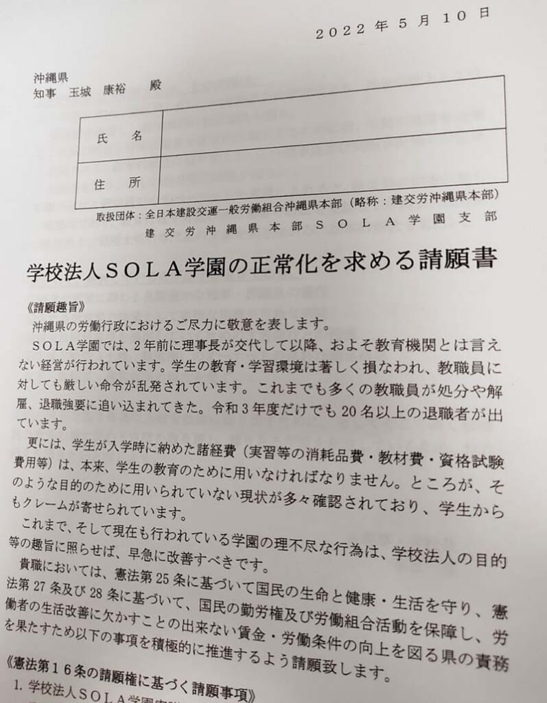SOLA学園の労組が出した正常化を求める請願書