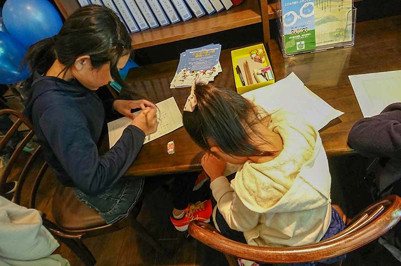 開成柏屋内「ポケットガーデン」で詩を作る子供たち(青い窓の会提供)