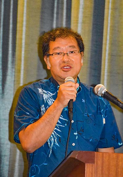 講演する宮城渉氏 沖縄県宜野湾市の沖縄コンベンションセンター