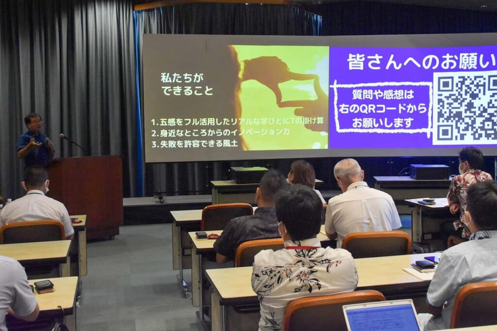 沖縄を代表して講演したのは、沖縄本島に陸路で移動できない津堅(つけん)島にある公立学校、津堅小中学校の宮城渉(わたる)教諭だ。うるま市では、ICT活用島しょ地域児童生徒交流実証事業が行われている。