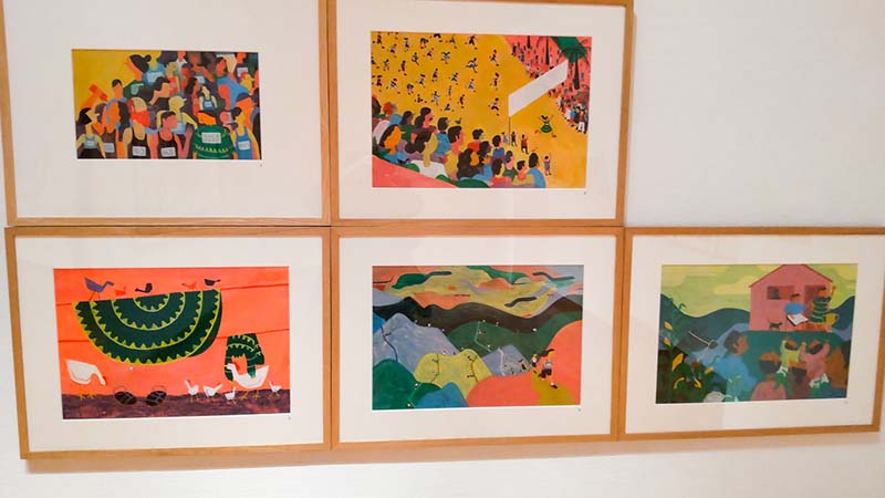 コロンビアのアンドレス・ムニョス=クラロスさんの「山をかけるロレナ・ラミレス」は自国のマラソンのヒーローを取り上げ、多くの観衆の中を民族衣装でさっそうと走る姿を鮮やかな色彩で描いている。最後の場面では険しい山河を越えて無事に自宅にたどり着き、家族に迎えられる。そのぬくもりを伝えている。