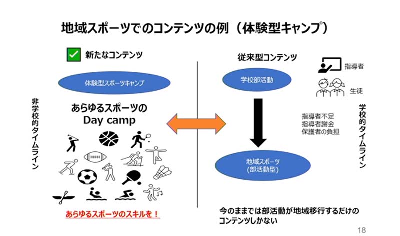 学校の活動を地域に移行するというだけではなく、社会教育として、いろんなスポーツがプロ化され、地域で行われている。フィットネスジムがあったり、ここ十数年でそういった土壌ができている。身体の機能を開拓し、体力が向上すると、どんなスポーツも楽しめるようになる。可能性を求め、地域・年齢・経済的格差をなくそうという試みだ。