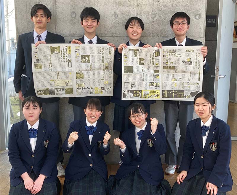 生徒を指導したビダイフデザインラボ担当の澤田弦吾講師は、「新聞は約1カ月で作りました。専門家の意見を踏まえ、題字や段組、文字の大きさ、四コマ漫画、広告を各面に入れています。見出しと文字はあえて手書きとし、みんなに楽しんで作ろうと言いました」と振り返る。