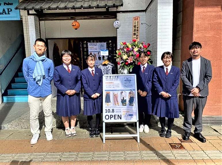 企画したのは商業研究グループの大山あかりさん、小野寺美優さん、小竹美貴さん、渡辺柊さんの水沢商業高校3年生の4人組だ。1年生の頃からアパレル廃棄問題と地域活性化に着目し、研究・実践を重ね、その集大成として水沢駅前にアパレルオフプライスストア「OASIS(オアシス)」を昨年10月8日にオープンした。