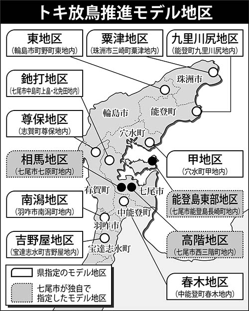 能登地域が放鳥候補地に選ばれたことを受け、県は餌場として整備するモデル地区を選定した。輪島市や七尾市、珠洲市、能登町など九つの市と町で、それぞれ1カ所ずつ選んだ。モデル地区になると、人の手による管理も必要になってくる。