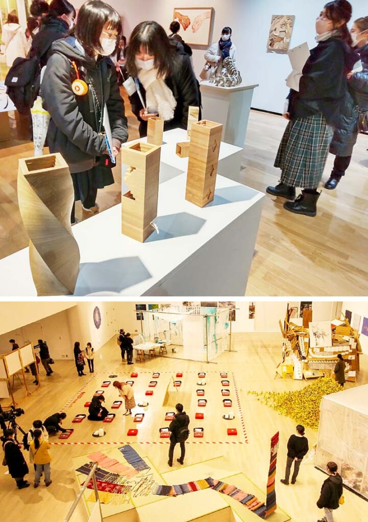 ほかにも、毛糸で十数点のサボテンを作ったり、土とガラスを同時焼成した大西さんの3作品、母娘の心の交流を表現した重さ2㌧もの紙の塊、組木を立体的に組み合わせた小野さんの「透重」、100点ほどの小スケッチを壁一面に並べた作品など学生の思いが噴き出ているユニークな作品が多かった。見学に来た70代女性は「すべてが圧巻です。学生の説明を聞くと、見方が変わります」と感想を述べた。
