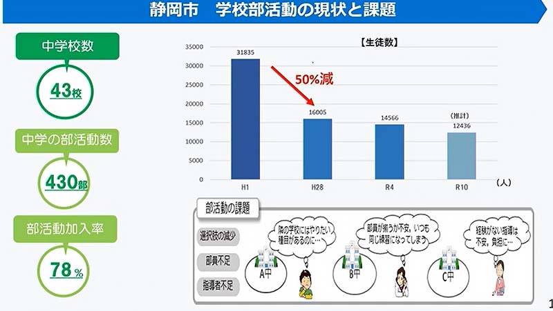 中学生の学校部活動には課題も見えている。平成元年に3万人余りいた中学生が平成28年に1万6000人余と半減、令和4年1万4566人へと減少を続けている。学校数は変わっていないので、各学校の規模が小さくなっているということ。