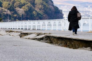 震度5強の地震で大きくひび割れた地面=22日午前、大分