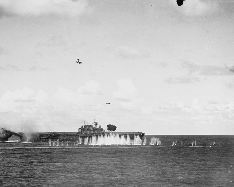 南雲機動部隊が攻撃機の目標をミッドウェイ島から敵空母に転じ、一度陸用爆弾に代えた兵装を再び魚雷に戻す転換作業の最中、直上に突如現れた米艦載機の急降下爆撃を受け、瞬時にして加賀、蒼龍(そうりゅう)、赤城の空母3隻は大火災に陥った。南雲は炎上する赤城から将旗を駆逐艦風雲(かざぐも)、次いで巡洋艦長良(ながら)に移す。その間、唯一健在の空母飛龍から飛び立った攻撃機が空母ヨークタウンを大破(後に伊号潜水艦の雷撃で沈没)させた。