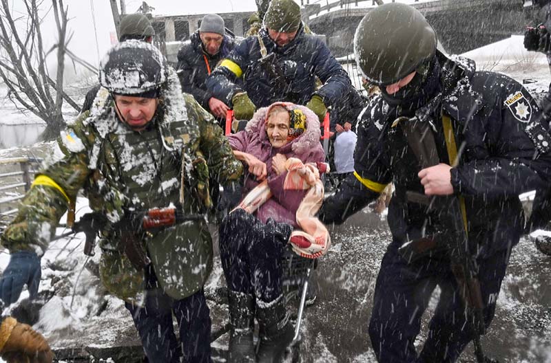 8日、キエフ近郊イルピンで、雪の中、兵士らに助けられ避難するウクライナの高齢者(AFP時事)