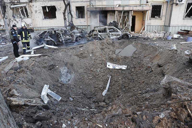 20日、ロシア軍のミサイル攻撃でキエフの住宅街にできた巨大な穴(EPA時事)