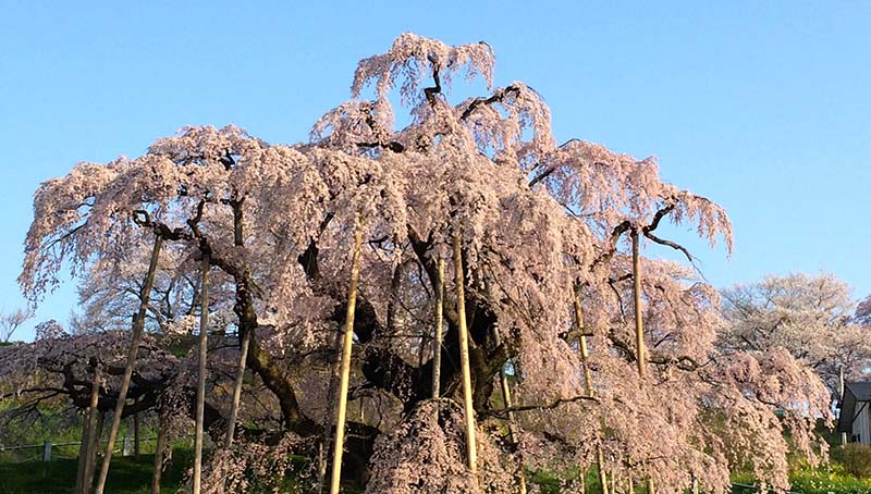 樹齢1000年を誇る福島県の三春滝桜は、国の天然記念物に指定されて今年で100年になる。今週前半は初夏を思わせる陽気で、一挙に満開になったというので訪ねた。