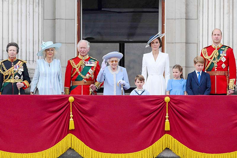 2日、バッキンガム宮殿のバルコニーに立つエリザベス英女王(中央)やチャールズ皇太子(左隣)ら王室メンバー(AFP時事)