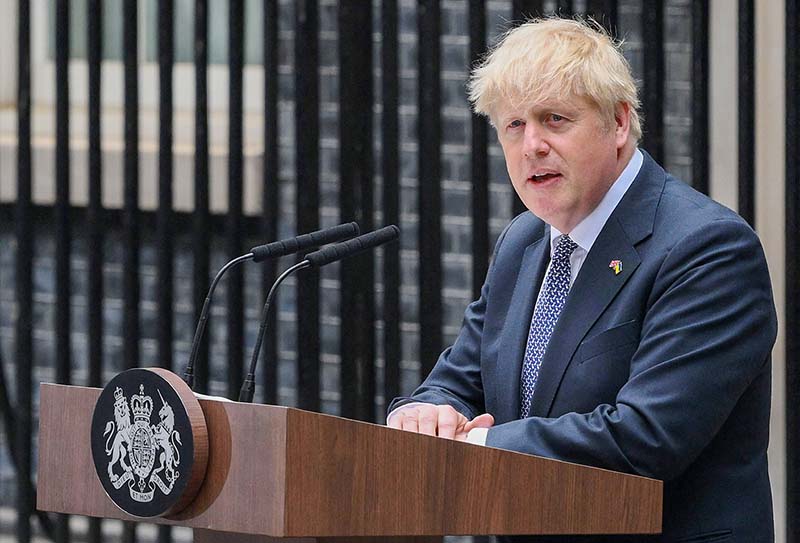 7日、ロンドンの官邸前で声明を発表し、辞意を表明するジョンソン英首相(「AFP時事)