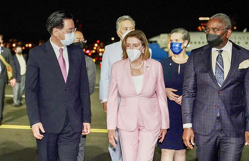 2日、台北・松山空港に到着したペロシ米下院議長(中央)=台湾外交部(外務省)提供(EPA時事)