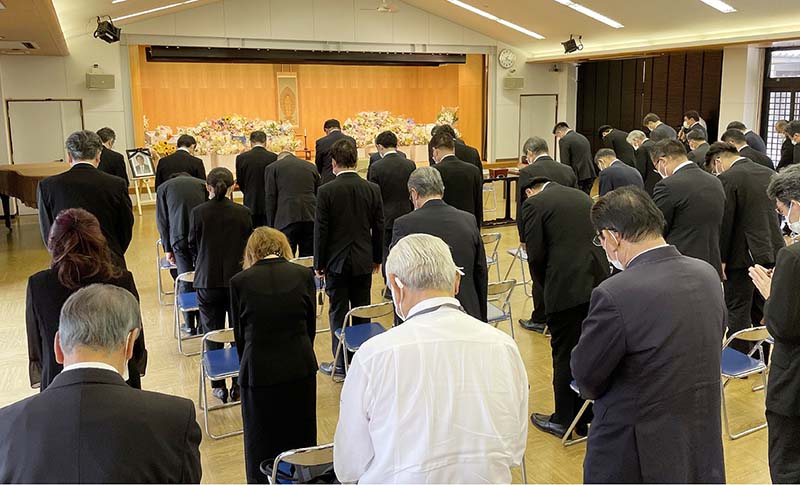 安倍晋三元首相の銃撃現場に供えられた花を供養する「花供養法要」で、黙とうする参列者=7月18日午後、奈良市