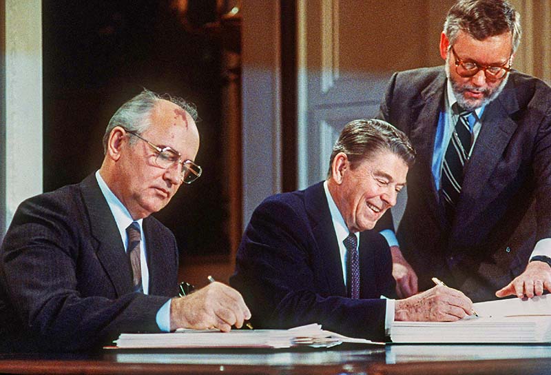 全廃条約に調印するゴルバチョフ・ソ連共産党書記長(左)とレーガン米大統領(ともに当時)=1987年12月、ワシントン(AFP時事).jpg)