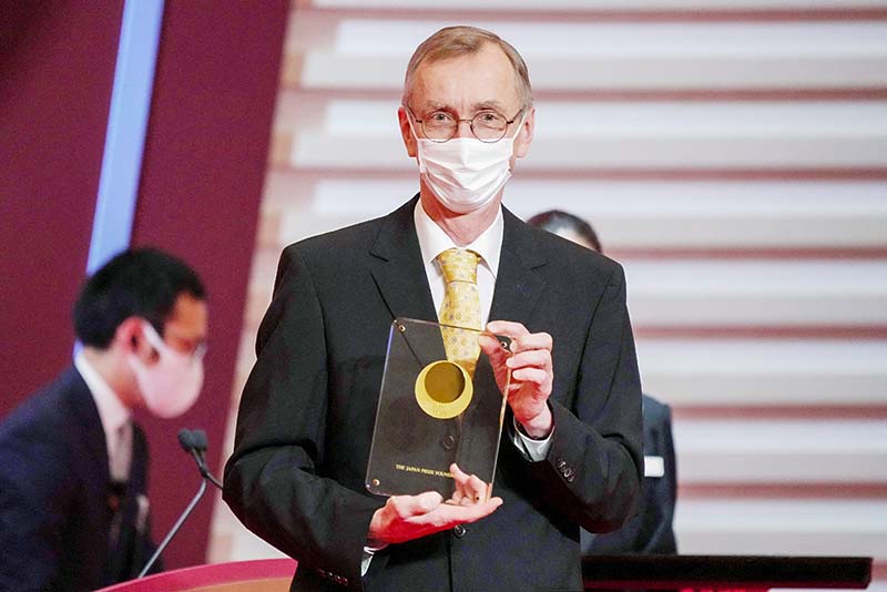 日本国際賞の授賞式に出席したスバンテ・ペーボ氏。コロナ禍で2020~22年の3年分の受賞者が集まった=4月13日、東京都千代田区(AFP時事)