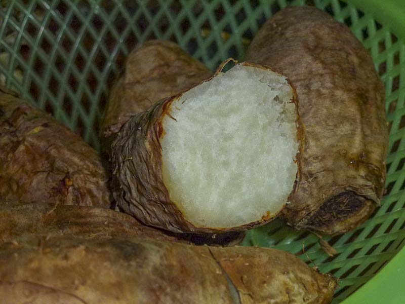 その正体は、クーガ芋と呼ばれる琉球自然薯。和名ははり芋、学名はトゲドコロ。沖縄で2000年前から自生しており、ごく一部の農家で栽培されていた自然薯(じねんじゅ)。秋の季節になると一部のファーマーズマーケットなどに出回るが、出荷量はそれほど多くない。