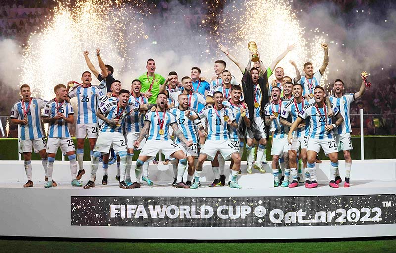 優勝トロフィーを掲げるメッシを囲むように、喜ぶアルゼンチンの選手=18日、ルサイル(時事)