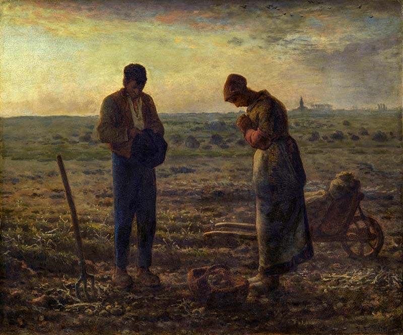 平原に夕べの鐘が鳴り響いてくると、農民夫婦は手を休め静かに祈る――。フランスの画家ミレーが油彩画「晩鐘」に描いた構図である。