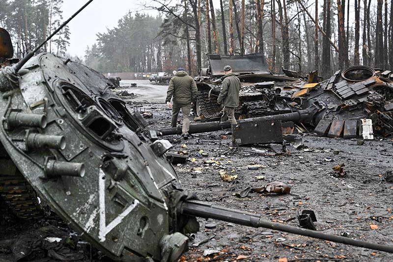 破壊されたロシア軍の戦車と装甲兵員輸送車=昨年4月2日、キーウ(キエフ)近郊(AFP時事)