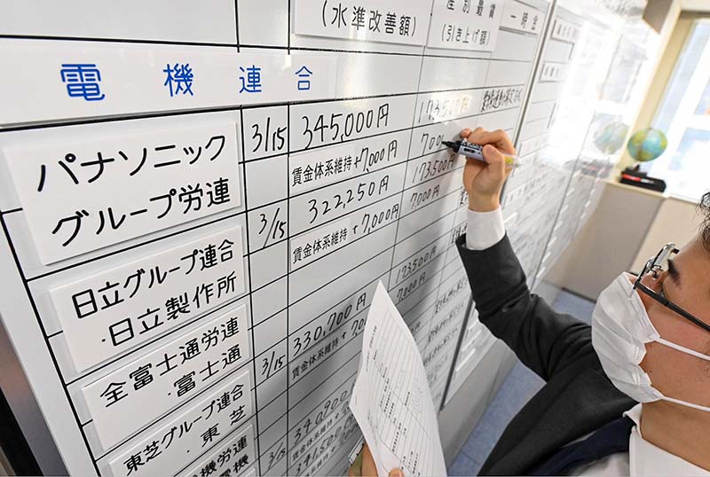 労使交渉の回答状況をボードに書き込む金属労協の職員=15日午前、東京都中央区(代表撮影)