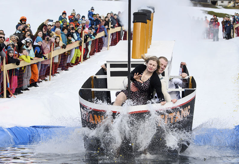 19日、スイス西部ヤウンで開かれたウオータースライダー大会で、「タイタニック号」を模したそりに乗り、スキー場の雪を掘って造られたプールに勢いよく飛び込む参加者。