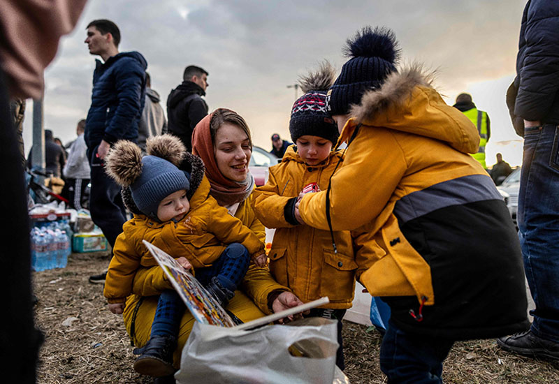 26日、ウクライナから国境を越え、ポーランド東部プシェミシルにたどり着いた避難民(AFP時事)