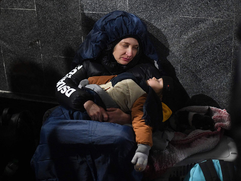 首都キエフで攻撃続く、地下シェルターに駆け込む市民