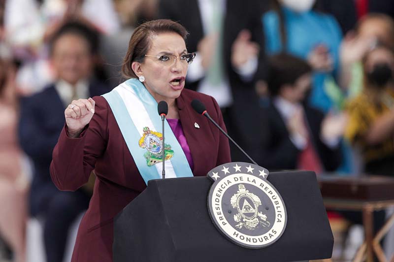 27日、テグシガルパで行われた就任式で演説するホンジュラスのシオマラ・カストロ大統領(EPA時事)