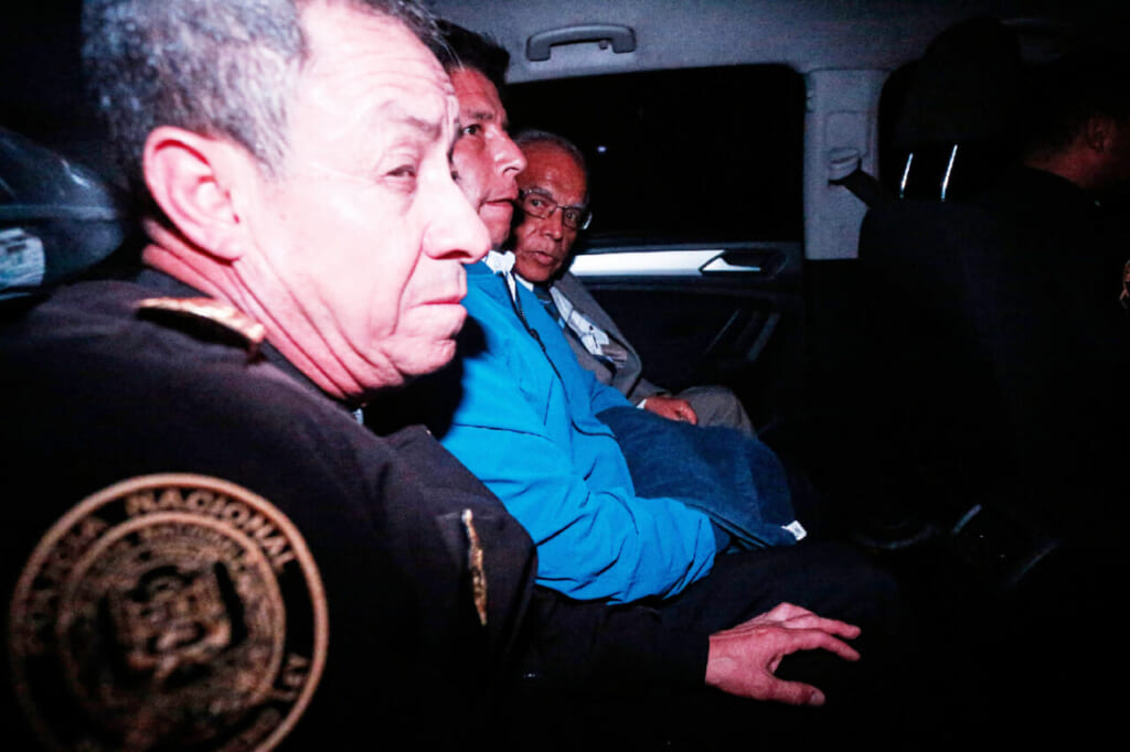 7日、ベルーの首都リマで、警察車両に乗ったカスティジョ前大統領(中央)(AFP時事)
