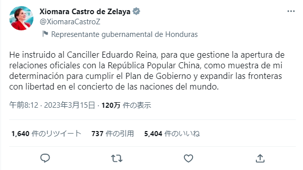 昨年1月に就任したカストロ氏は、ホンジュラス初の女性大統領として注目を集めた。親中派の同氏は、大統領選当時から「台湾と断交して中国と国交を結ぶ」ことを公言してきたが、当選後は、米国と台湾から激しい外交攻勢を受けて台湾との国交を維持する意向を示してきた。