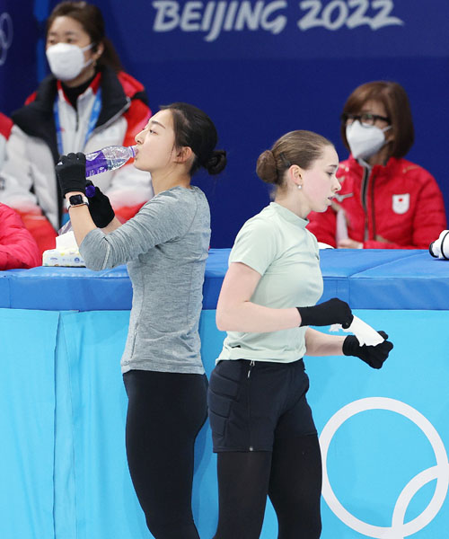 フィギュアスケート女子フリーに向けて練習する坂本花織(左)とワリエワ=16日、北京(時事)
