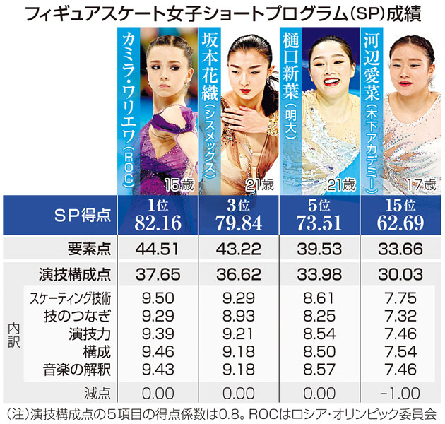 坂本は完成度でロシア・オリンピック委員会(ROC)の強豪3人と勝負できるかがカギ。SP82・16点で首位のカミラ・ワリエワ、80・20点で2位のアンナ・シェルバコワ、74・60点で4位のアレクサンドラ・トルソワは、いずれもフリーで4回転ジャンプを入れてくる。