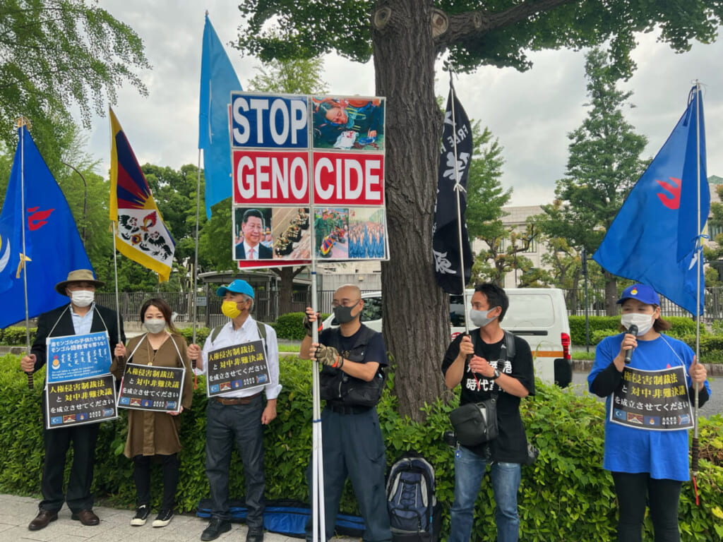 通常国会の会期末が迫る10日、参院での対中非難決議と人権侵害制裁法の成立を求めて東京・永田町の国会議員会館前で集会が行われた。