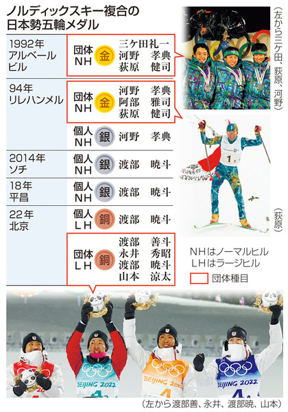 五輪の団体メダルは、荻原健司を中心に3人制だった1994年の金以来(当時はノーマルヒル)。ラージヒルで争われた今回は、絶対的エースの渡部暁、安定感のある渡部善、五輪は今回が最後と決めて臨んだ38歳の永井、それに進境著しい24歳の山本という強力なチームが、複合日本の長年の願いをかなえた。2009年世界選手権で団体優勝経験がある渡部暁は「長い時間がかかったが、この瞬間を共有できてうれしい」。