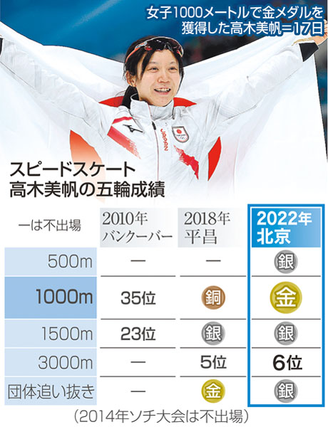 極限まで自分を追い込む競技で5種目を滑り切り、銀3個を含めて四つのメダルを獲得。滑走のたびに激しいせきを整え、「内臓というか体の中の方がぎりぎりだった。結構限界が来ていた」。世界記録を持つ1500メートルでも、連覇が懸かった団体追い抜きでも届かなかった頂点。ぼろぼろになっても自分を信じ抜いた姿は、金メダリストにふさわしかった。(時事)