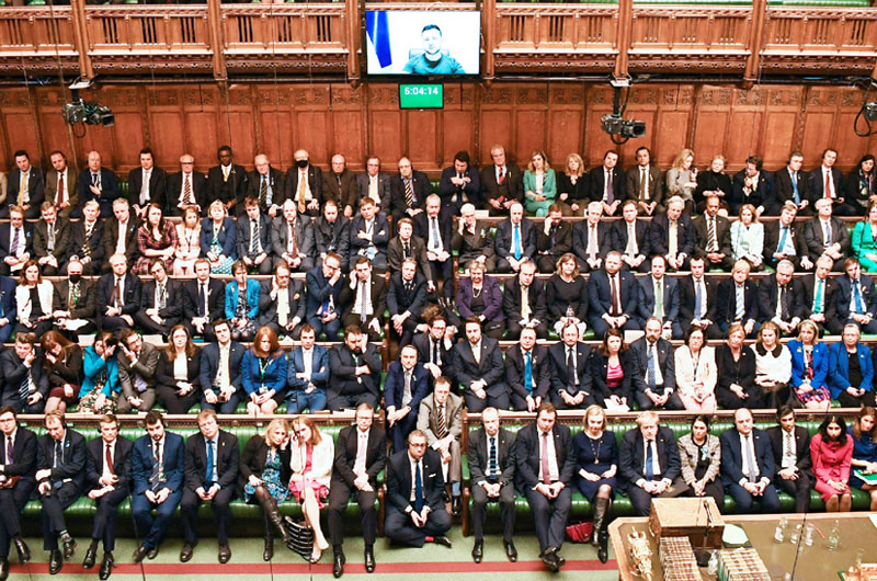 ウクライナのゼレンスキー大統領は8日、英議会でオンライン形式で演説し、「海で空で、われわれは最後まで戦う。いかなる犠牲を払おうとも、われわれの土地を守るために戦い続ける」と述べた。第2次世界大戦中の1940年、ナチス・ドイツとの対決を宣言した英首相チャーチルの有名な議会演説を引用し、ロシアとの対決姿勢を鮮明にした。