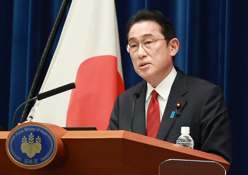 対ロシア追加制裁の記者会見に臨む岸田文雄首相=8日午後、首相官邸
