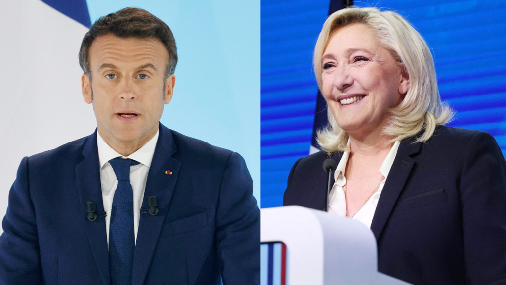 10日、パリでフランス大統領選第1回投票の結果を支持者向け演説するマクロン大統領(左)と「国民連合(RN)」のルペン氏(AFP時事)