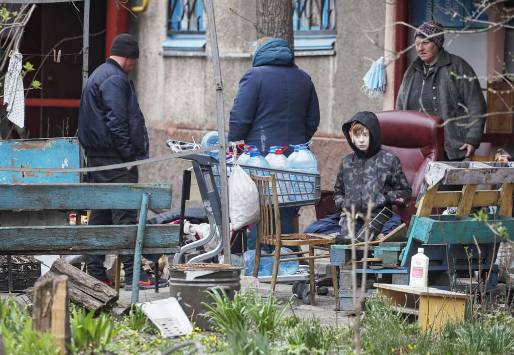 12日、ウクライナ南東部マリウポリの集合住宅そばで料理する住民ら(EPA時事)