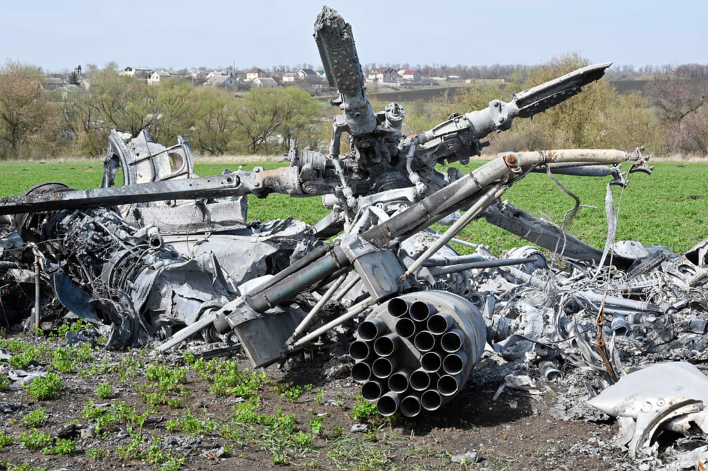 16日、ウクライナ東部ハリコフ近郊の野原に横たわるロシア軍ヘリコプターの残骸(AFP時事)