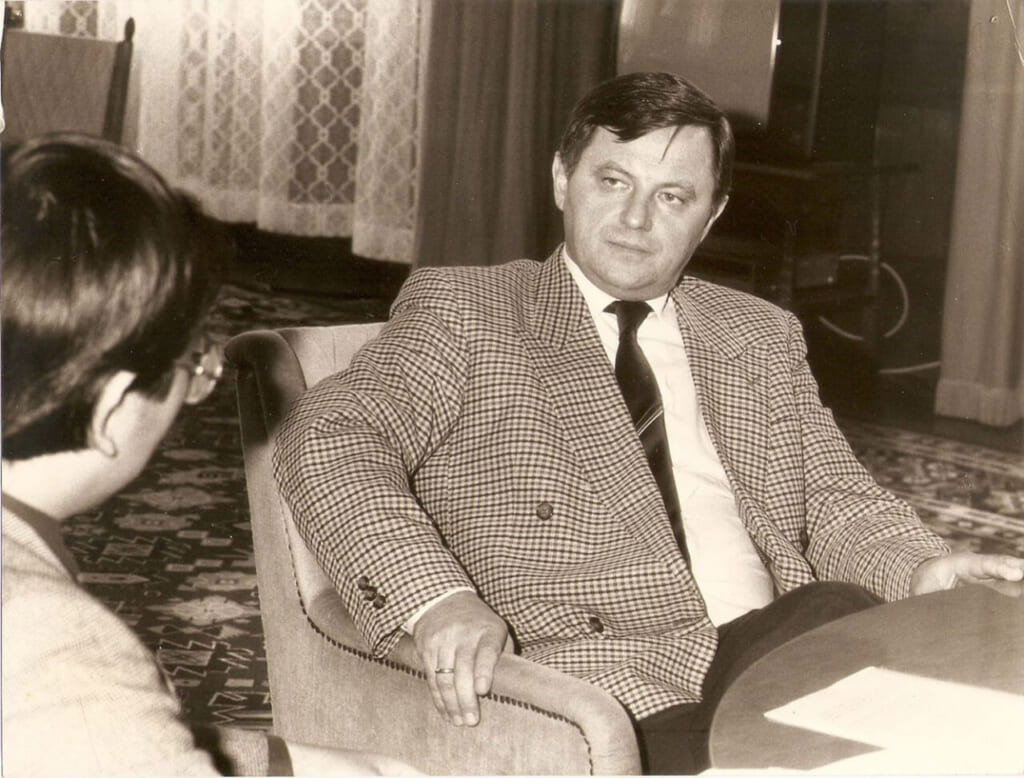 記者のインタビューに応じるハンガリー共産党政権最後の首相、ミクローシュ・ネーメト氏=1989年10月2日、首相執務室で(ハンガリー国営MTI通信)