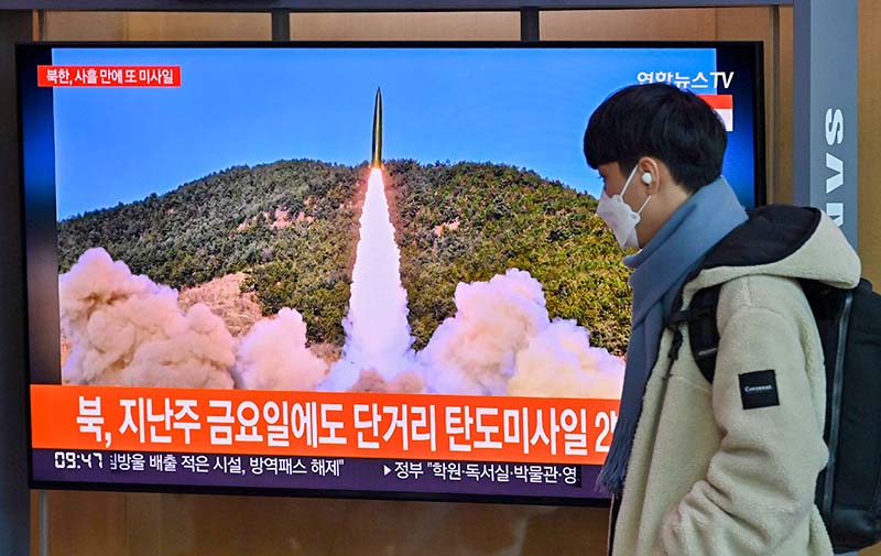 17日、韓国ソウルの駅構内で、北朝鮮によるミサイル発射のニュースを見る男性(AFP時事)