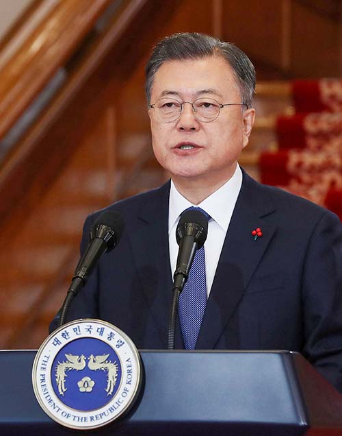 ソウルの青瓦台で演説を行う韓国の文在寅大統領=1月3日(EPA時事)