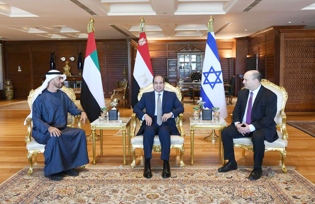 エジプト東部シャルムエルシェイクで22日、会談に臨むイスラエルのベネット首相(右)とエジプトのシシ大統領(中央)、アラブ首長国連邦(UAE)のムハンマド皇太子(イスラエル政府報道局提供)