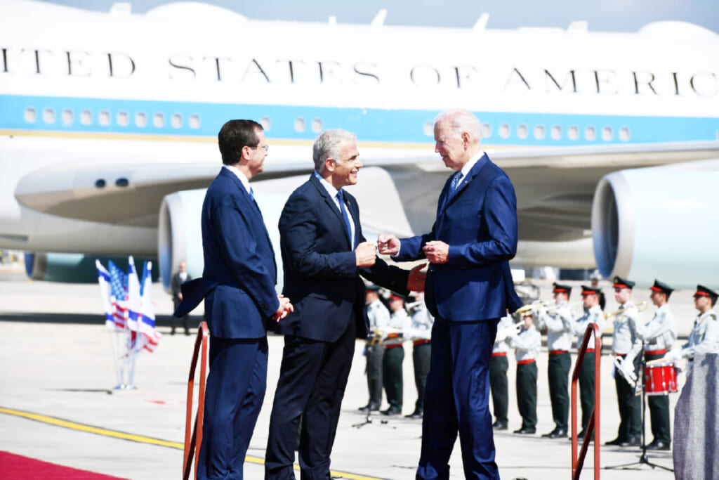バイデン氏は13日、テルアビブ近郊のベングリオン国際空港での歓迎式典でヘルツォグ大統領らの出迎えを受けた。バイデン氏はラピド氏の肩を軽くたたいてあいさつし、互いの拳を合わせ両国の関係をアピールした。