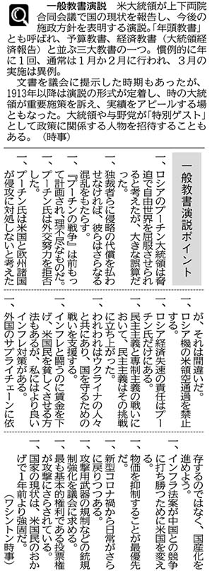最大の競争相手と位置付ける中国については、昨年に超党派で成立させたインフラ投資法の成果をアピールする中で言及し、「米国を変革させ、特に中国との経済競争に勝つための道筋をつけるものだ」と訴えた。一方、ミサイル発射が相次ぐ北朝鮮や米軍撤退時に混乱を招いたアフガニスタンについての言及はなかった。