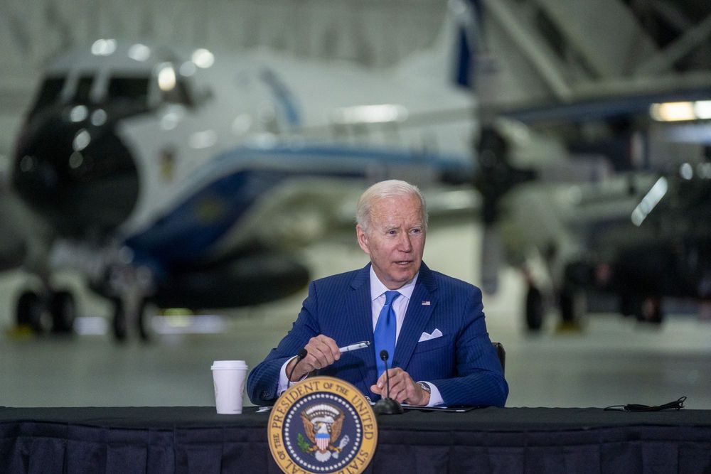 アンドルーズ空軍基地で演説するバイデン米大統領=5月18日(UPI)